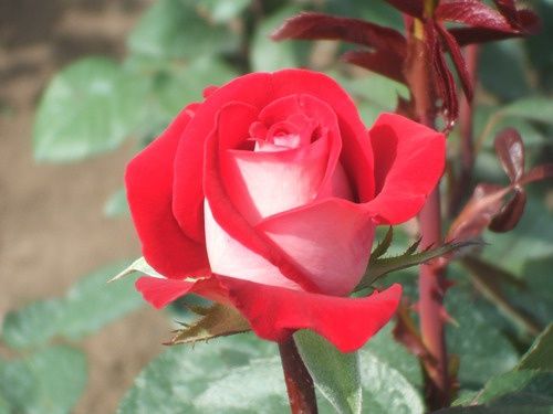 Саженец чайно-гибридной розы Latin Lady отличается насыщенно-красными лепестками с белым оттенком на внешней стороне. Бутоны имеют бокаловидную форму, а цветы, диаметром около 5 см, махровые и обладают эффектной, слегка кокетливой формой. Листья матовые, темно-зеленого цвета.